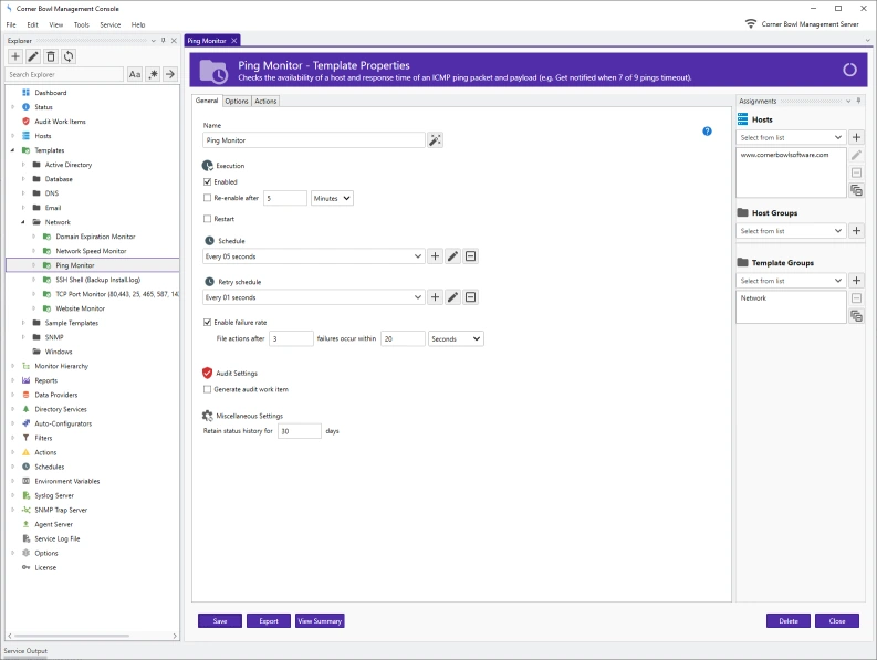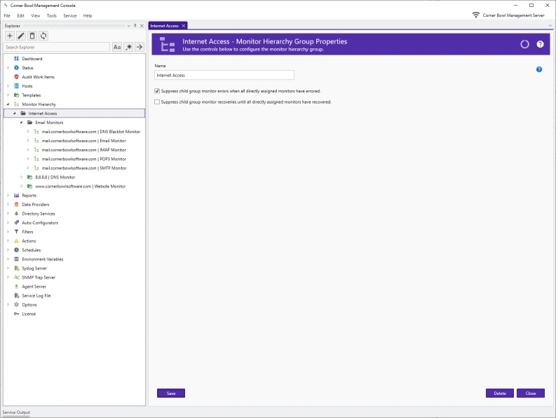 Corner Bowl Internet Server Monitor is an extensive enterprise-class software monitoring and management tool for IT professionals that minimizes downtime by proactively notifying IT when degraded server and application performance is detected. Includes uptime monitoring, website monitoring, email server monitoring, SSL certificate monitoring, database monitoring, Windows server monitoring, SNMP monitoring and much more. Supports Windows, Linux and Docker containers.